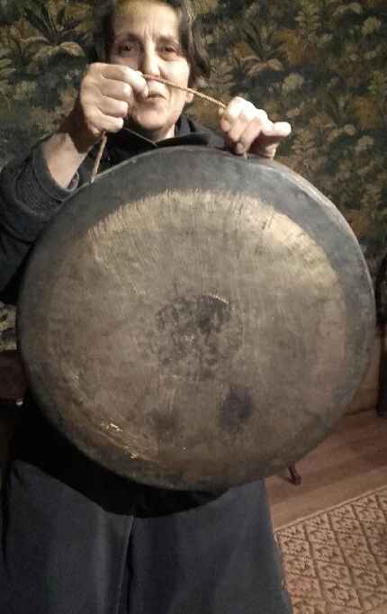 Marie Claude tenant le gong de Pasteur dans ses mains